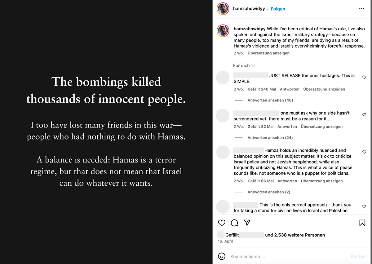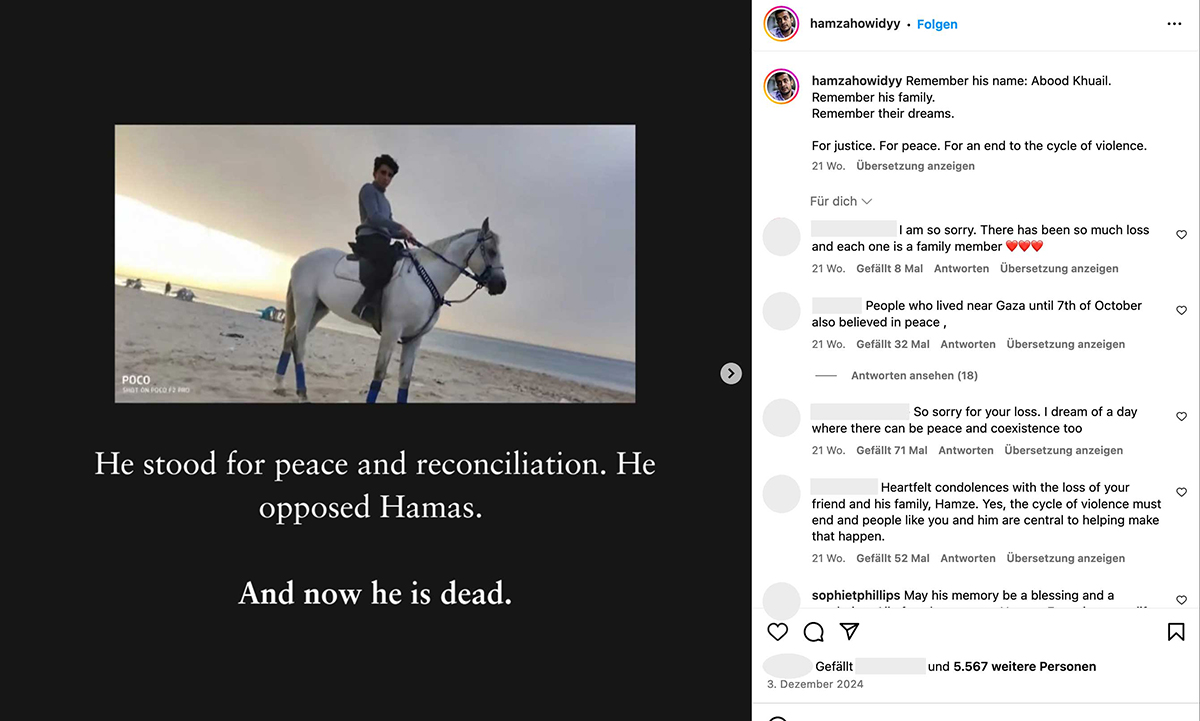 Howidy criticizes Hamas’s criminal policies. He considers the pro-Palestinian protests in the West to be hypocritical. These protests, he argues, reveal the intellectual dishonesty of a narrative that classifies all residents of the Gaza Strip as either accomplices or victims of Hamas violence, thereby dehumanizing them. Howidy condemns Israel’s warfare because of the many civilian casualties. On December 3, 2024, for example, he posted a sad message on Instagram. A few days earlier, his friend Abood Khuail had been killed by an Israeli bomb in Gaza, along with eleven members of his family. Howidy wrote: “The Khuails weren’t Hamas. They weren’t a threat. They were just a family trying to survive. My friend Abood dreamed of a two-state solution where Palestinians and Israelis could coexist with dignity and freedom.” A few months later he criticized that “there is no safe place for Gaza’s children – no shelter from the bombs, no escape from the violence that rains down from above.”